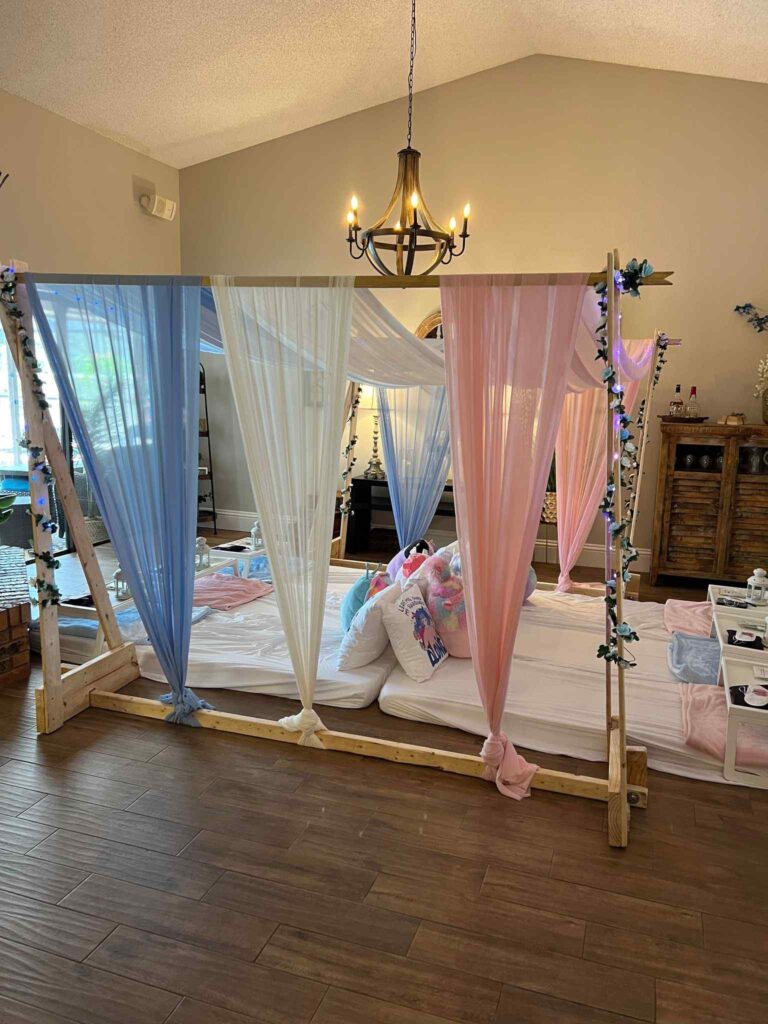 Step into a fairytale fantasy with Slumberr’s enchanting canopy sleepover. Picture yourself surrounded by flowing curtains, twinkling lights, and whimsical decorations. It’s a sleepover experience straight out of a storybook.