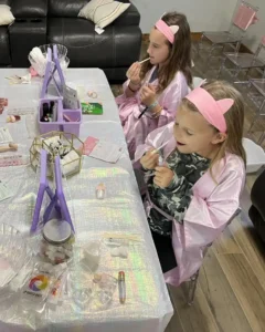 Our lip gloss station is a party favorite, letting guests design two personalized glosses from scratch. Kids choose their own colors, glitters, and scents—and even add cute lip gloss charms to one of their creations. With a guided setup and everything provided, this hands-on DIY lip gloss activity is perfect for any celebration.