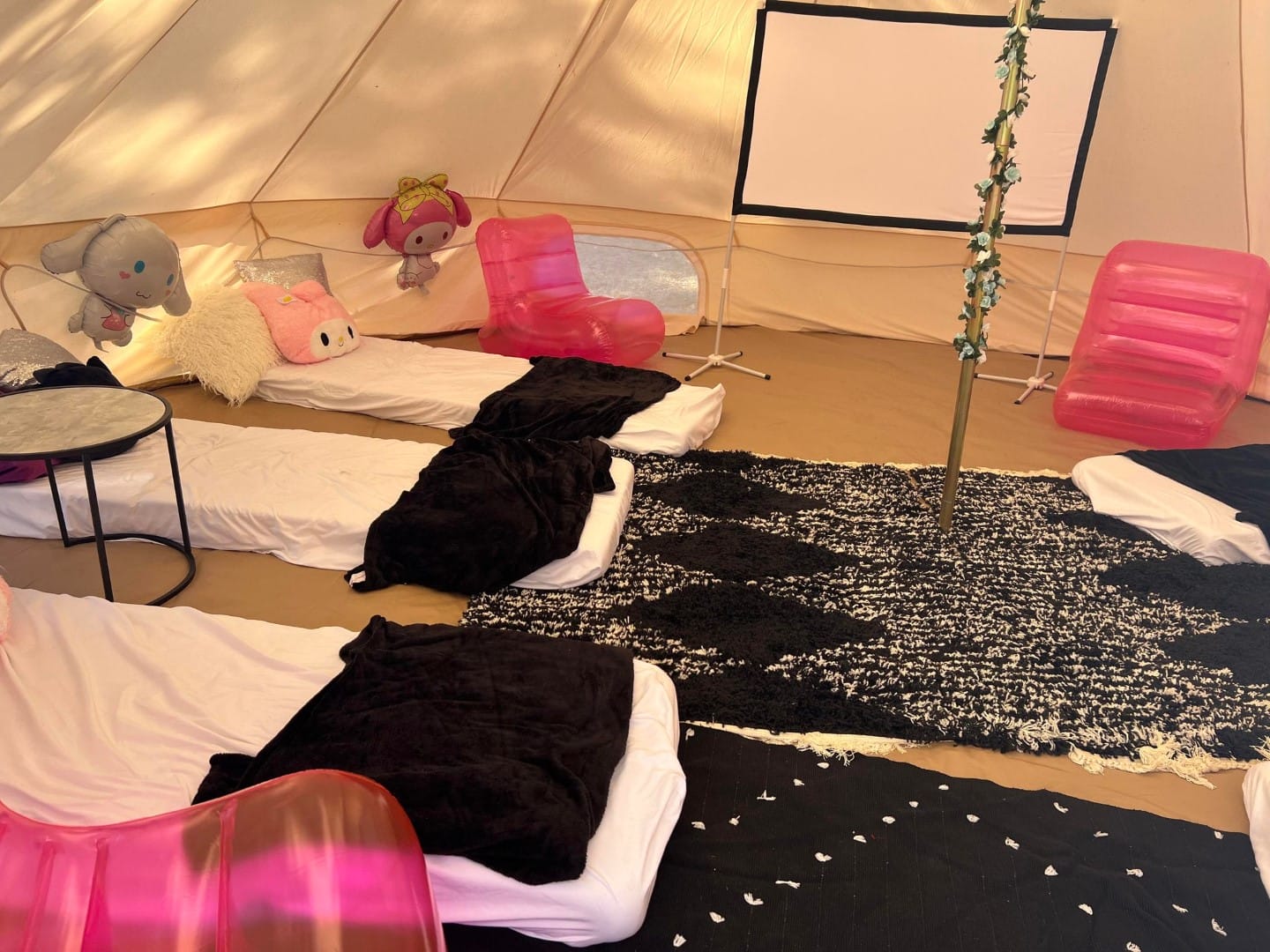 - Glamping Bell Tent – Sleep outside in style with luxurious bedding and decor.