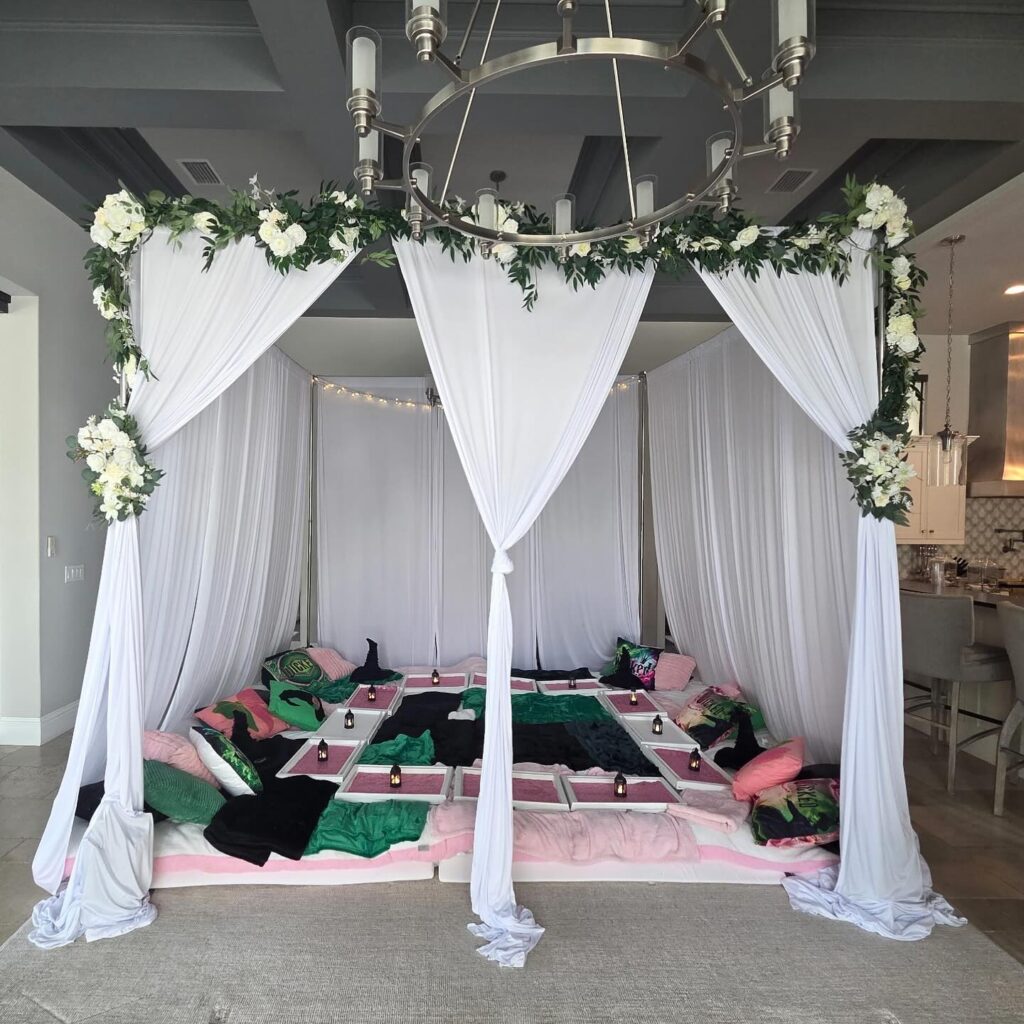 The showstopper for milestone birthdays or epic friend nights. A spacious 20×20 footprint with memory-foam cushioning, coordinated pillows, garland, lanterns, trays, and gentle lighting that makes the whole space glow.