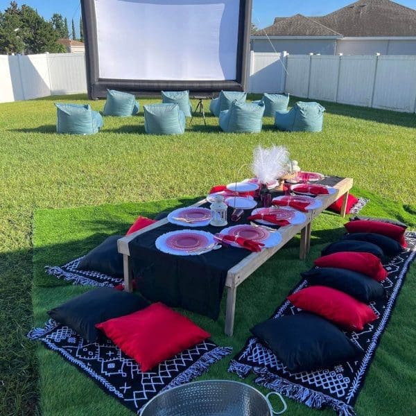 Luxury PicnicOur luxury picnic includes a decorated picnic table, with cups, silverware, plates & napkins. Along with centerpieces that match your theme and comfy pillows to sit and enjoy your picnic.