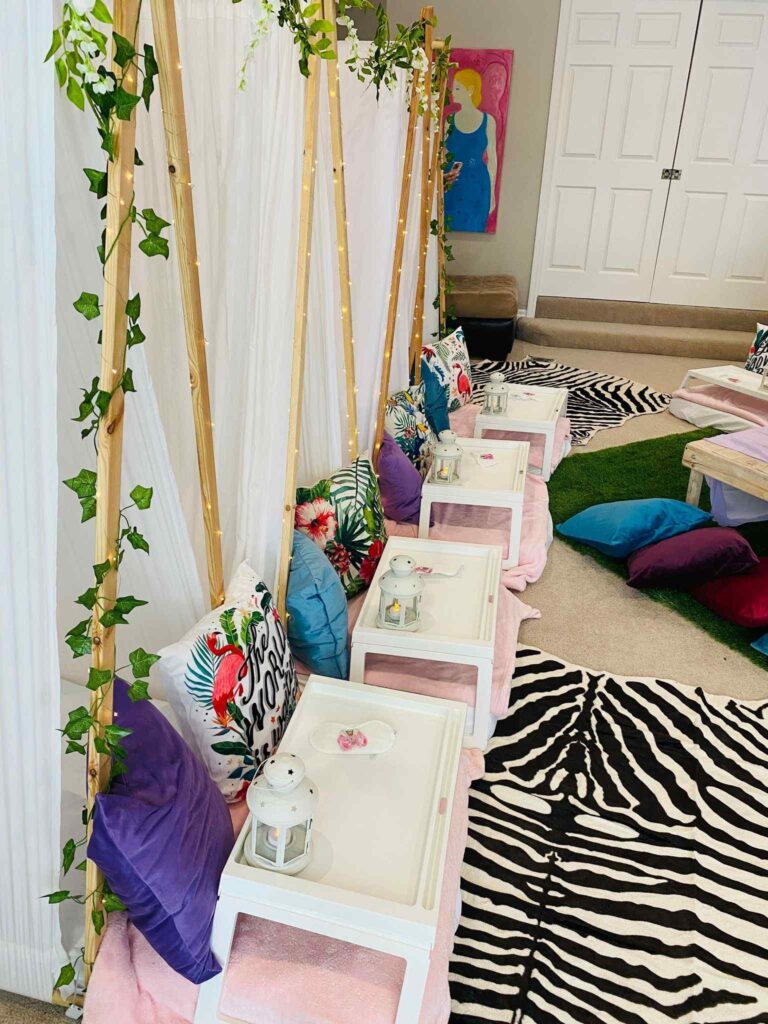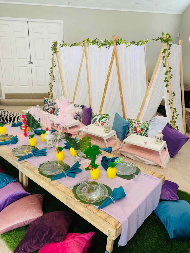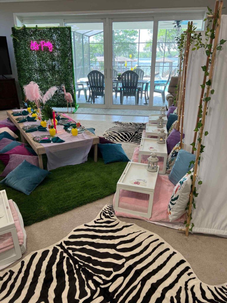 If you are looking for a unique and exotic way to celebrate your upcoming birthday, a tropical slumber party could be the perfect fit. You can choose us at Slumberr to help you with this or DIY it yourself! We created one with a luxury picnic, a greenery backdrop, and of course, teepee sets. It wouldn’t be tropical if it didn’t include zebra rugs, Tropical stuffed animals (leopard, flamingo, and snake). This theme is sure to bring an exciting and unforgettable experience to you and your guests. Creating the perfect tropical slumber birthday party can be a daunting task, but it doesn’t have to be! From choosing a party date to accessorizing the space with leopard stuffed animals and zebra rugs, there are countless possibilities that will make your event special and unique. Whether you’re throwing the shindig for yourself or for someone else, these tips and tricks will help you plan the perfect tropical slumber birthday party!